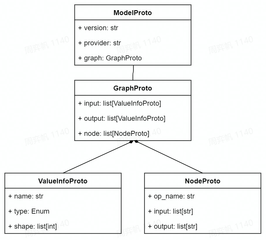 回想一下,神经网络本质上是一个计算图。计算图的节点是算子,边是参与运算的张量。而通过可视化 ONNX 模型,我们知道 ONNX 记录了所有算子节点的属性信息,并把参与运算的张量信息存储在算子节点的输入输出信息中。事实上,ONNX 模型的结构可以用类图大致表示如下: