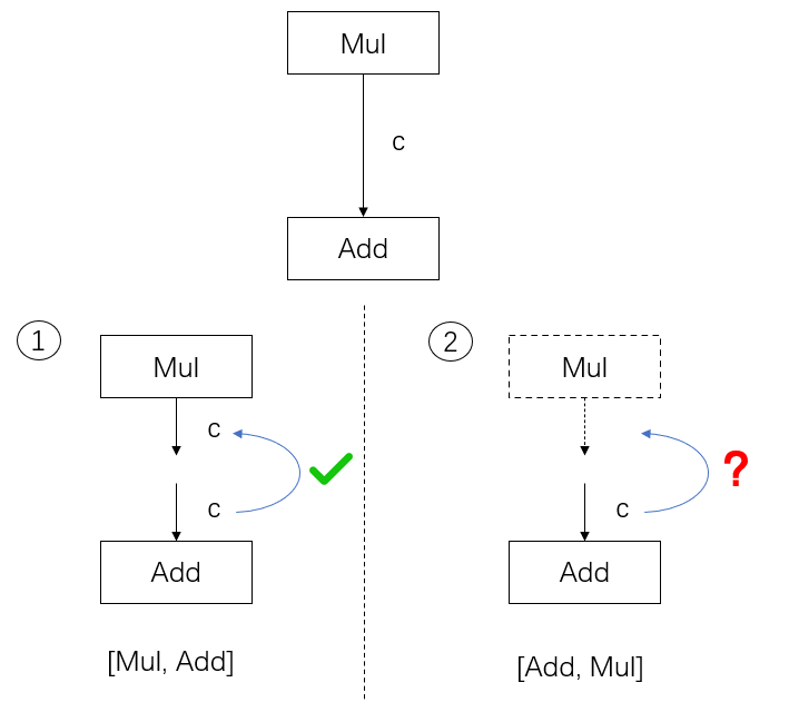 这里我们只关注 Mul 和 Add 节点以及它们之间的边 c。在情况 1 中:如果我们的节点以 [Mul, Add] 顺序给出,那么遍历到 Add 时,它的输入 c 可以在之前的 Mul 的输出中找到。但是,如情况 2 所示:如果我们的节点以 [Add, Mul] 的顺序给出,那么 Add 就找不到输入边,计算图也无法成功构造出来了。这里的 [Mul, Add] 就是符合有向图的拓扑序的,而 [Add, Mul] 则不满足。