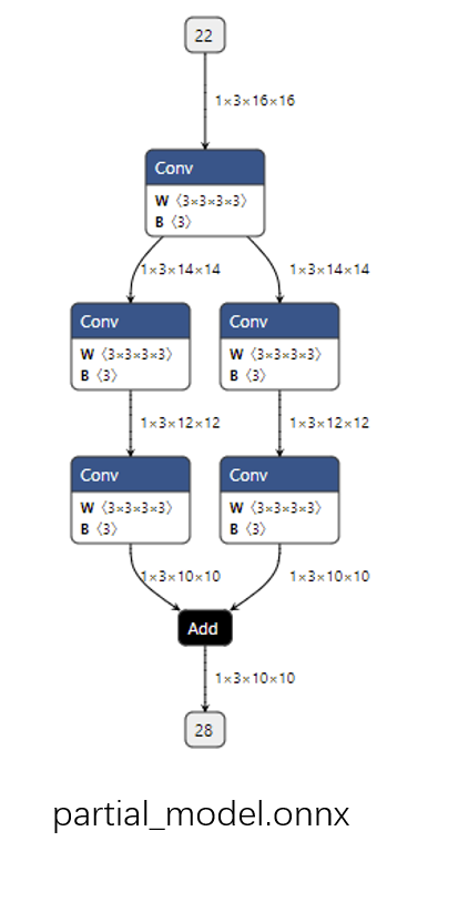 这样,用 ONNX Runtime 运行 more_output_model.onnx 这个模型时,我们就能得到更多的输出了。 为了方便调试,我们还可以把原模型拆分成多个互不相交的子模型。这样,在每次调试时,可以只对原模型的部分子模块调试。比如: