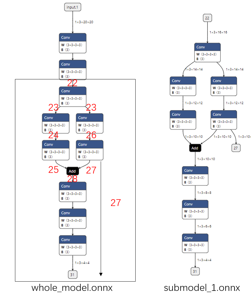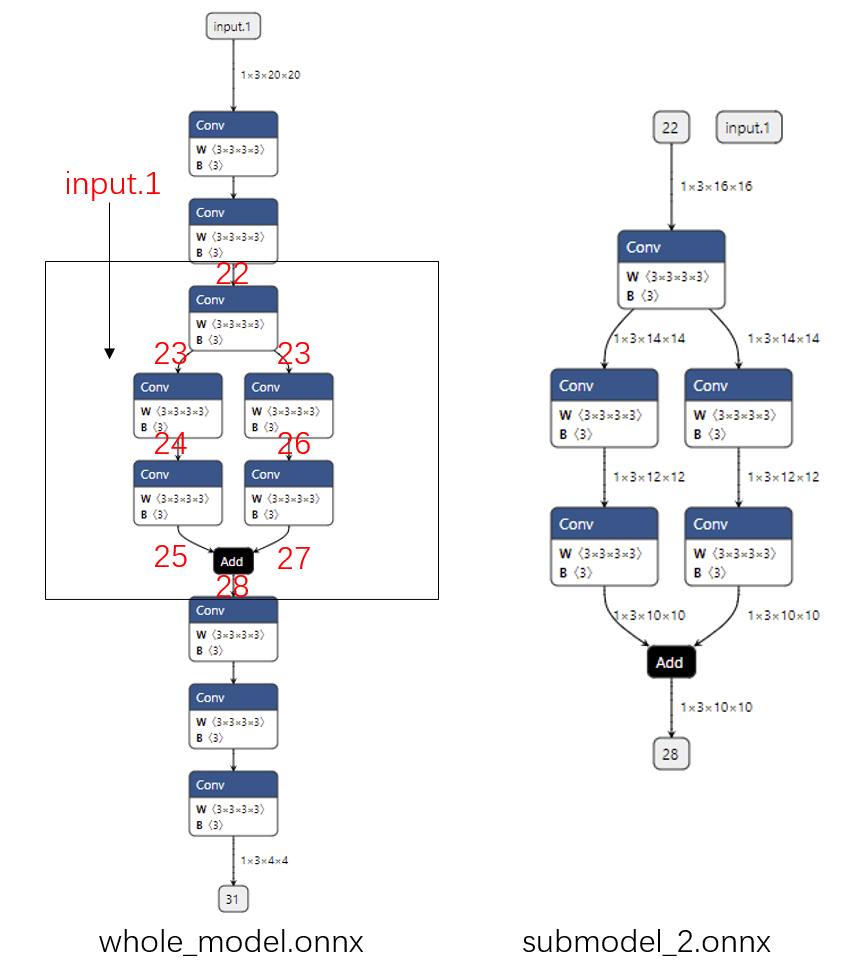 如果我们还是像开始一样提取边 22 到边 28 之间的子模型,但是多添加了一个输入 input.1,那么提取出的子模型会有一个冗余的输入 input.1,如下面的代码所示: